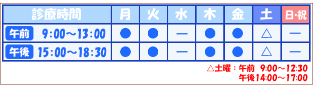| 土曜 | 午前 | 9:00~12:30 |